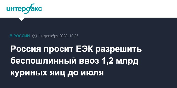 Москва. 14 декабря. INTERFAX.RU - Евразийская экономическая комиссия рассматривает просьбу России о тарифной льготе в виде освобождения от ввозной таможенной пошлины свежих яиц домашних кур (код 0407 21 000 0 ТН ВЭД ЕАЭС) в объеме 1,2 млрд штук, говорится в материалах ЕЭК.