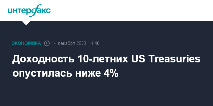 Доходность десятилетних US Treasuries опустилась в ходе торгов в четверг ниже отметки в 4% годовых, хотя еще в октябре она была выше 5%, отмечает Market Watch.
