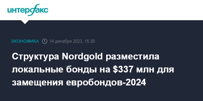 Москва. 14 декабря. INTERFAX.RU - ООО "Нерюнгри-Металлик", входящее в группу Nordgold, разместило локальные облигации на $337 млн для замещения выпуска еврооблигаций золотодобытчика с погашением в 2024 году, следует из раскрытия эмитента.