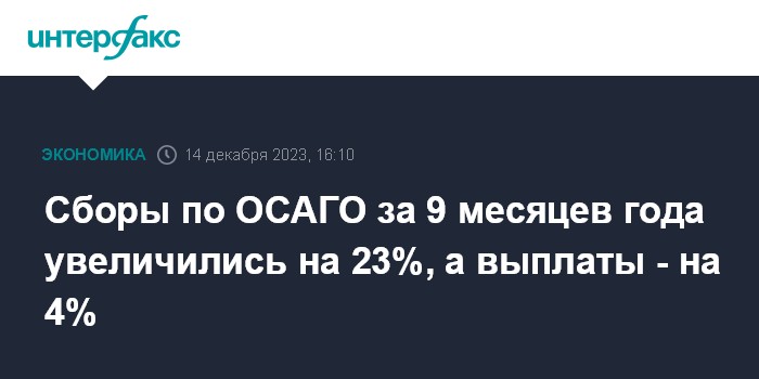 Москва. 14 декабря. INTERFAX.RU - Общие сборы российских страховщиков по ОСАГО за 9 месяцев года увеличились на 23% по сравнению с аналогичным периодом 2022 года и достигли 235,2 млрд рублей, согласно статистике Банка России. Совокупные выплаты по ОСАГО за период выросли на 4% и достигли 121,2 млрд рублей (по данным формы Банка России 042016).