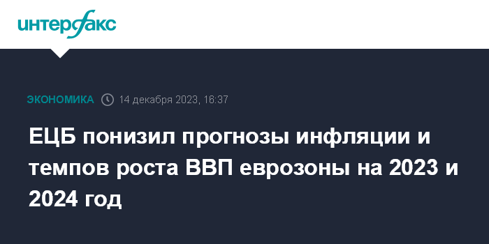 Москва. 14 декабря. INTERFAX.RU - Европейский центробанк понизил прогнозы инфляции и темпов роста ВВП еврозоны на 2023 и 2024 годы.