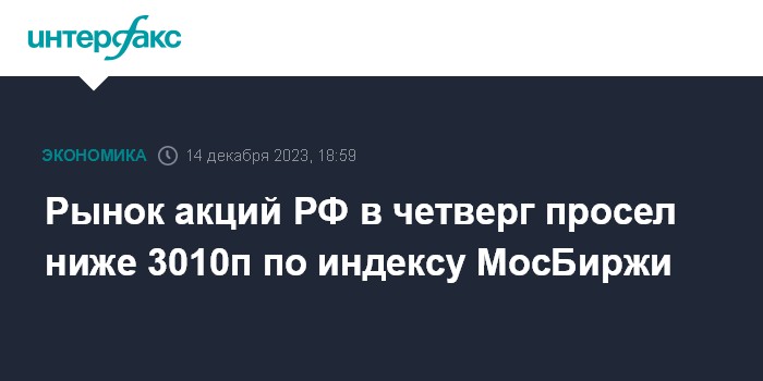Москва. 14 декабря. INTERFAX.RU - Рынок акций РФ в четверг откатился ниже 3010 пунктов по индексу МосБиржи из-за фиксации прибыли игроками после завершения годовой пресс-конференции президента РФ Владимира Путина и в преддверии ожидаемого повышения ставки ЦБ РФ на заседании в пятницу; фактором поддержки выступили подорожавшая нефть (Brent поднялась к $77 за баррель) и рост внешних фондовых площадок на сигналах от Федрезерва США о завершении текущего цикла ужесточения монетарной политики.