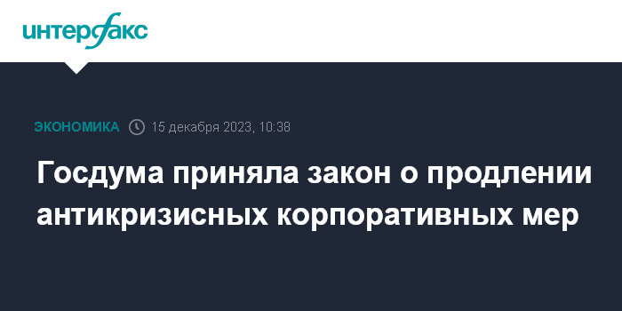 Москва. 15 декабря. INTERFAX.RU - Госдума приняла в третьем чтении закон, который продлевает антикризисные корпоративные меры. Часть из них пролонгируется только на полгода, в частности право компаний иметь "усеченный" состав совета директоров или в случае подпадания под санкции - не формировать его вовсе.