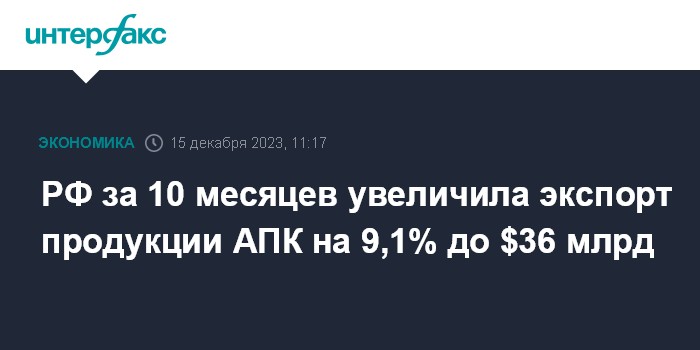 РФ за 10 месяцев увеличила экспорт продукции АПК на 9,1% до $36 млрд