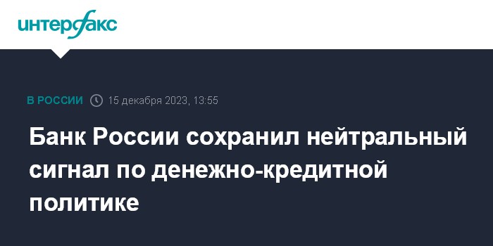 Москва. 15 декабря. INTERFAX.RU - Банк России, повысив ключевую ставку в рамках ожиданий рынка - на 100 б.п., до 16%, сохранил в заявлении по итогам совета директоров нейтральный сигнал о будущей направленности денежно-кредитной политики.