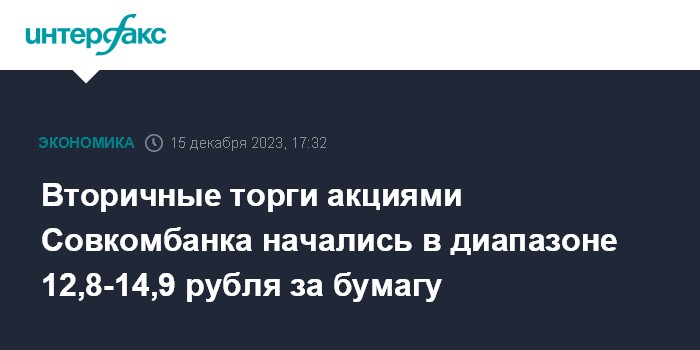 Вторичные торги акциями Совкомбанка начались в диапазоне 12,8-14,9 рубля за бумагу