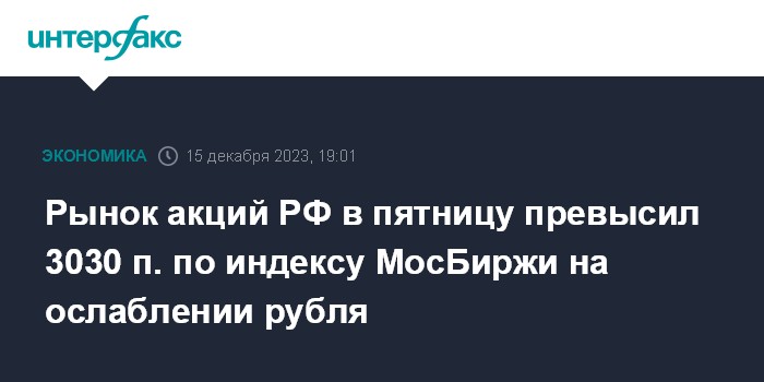 Рынок акций РФ в пятницу превысил 3030 п. по индексу МосБиржи на ослаблении рубля
