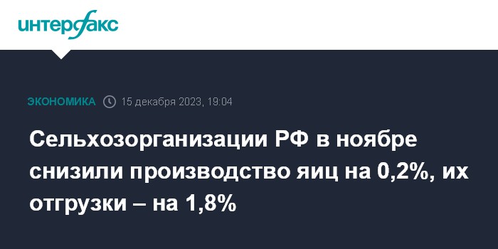 Сельхозорганизации РФ в ноябре снизили производство яиц на 0,2%, их отгрузки – на 1,8%