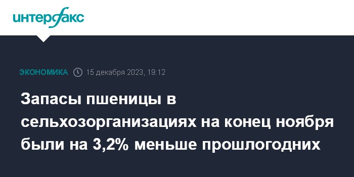 Запасы пшеницы в сельхозорганизациях на конец ноября были на 3,2% меньше прошлогодних