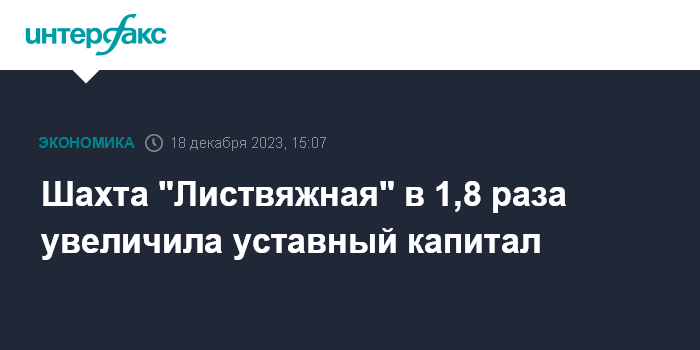 Москва. 18 декабря. INTERFAX.RU - Уставный капитал ООО "Шахта "Листвяжная" (входит в "СДС-Уголь") вырос с 7 млрд рублей до 12,5 млрд рублей, сообщается в ЕГРЮЛ. Показатель увеличился в 1,8 раза 15 декабря.