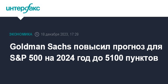 Москва. 18 декабря. INTERFAX.RU - Аналитики Goldman Sachs резко повысили прогноз для фондового индекса Standard & Poor's 500 на 2024 год, до 5100 пунктов с ожидавшихся в ноябре 4700 пунктов.