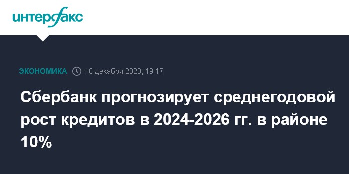 Москва. 18 декабря. INTERFAX.RU - Сбербанк прогнозирует среднегодовой рост кредитования в целом по банковскому сектору в 2024-2026 годах в районе 10%, сам планирует расти выше рынка, следует из презентации трехлетней стратегии кредитной организации.