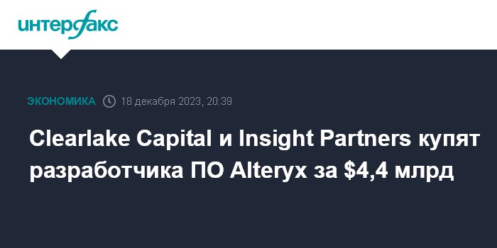 Москва. 18 декабря. INTERFAX.RU - Инвестиционные компании Clearlake Capital Group LP и Insight Partners достигли соглашения о покупке разработчика облачного ПО Alteryx Inc. с целью последующего делистинга компании, сообщила пресс-служба Alteryx.
