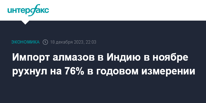 Москва. 18 декабря. INTERFAX.RU - Импорт алмазного сырья в Индию в ноябре 2023 года упал на 76% в годовом измерении и составил $314 млн, следует из предварительных данных Совета по содействию экспорту драгоценных камней и ювелирных изделий Индии (Gem & Jewellery Export Promotion Council, GJEPC).