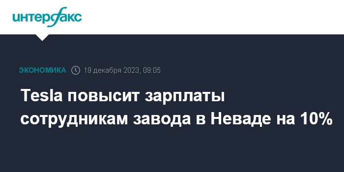 Москва. 19 декабря. INTERFAX.RU - Американский автопроизводитель Tesla проинформировал сотрудников завода в Неваде с почасовой оплатой труда о повышении зарплат на 10% с января следующего года, сообщает CNBC со ссылкой на внутренние документы компании.