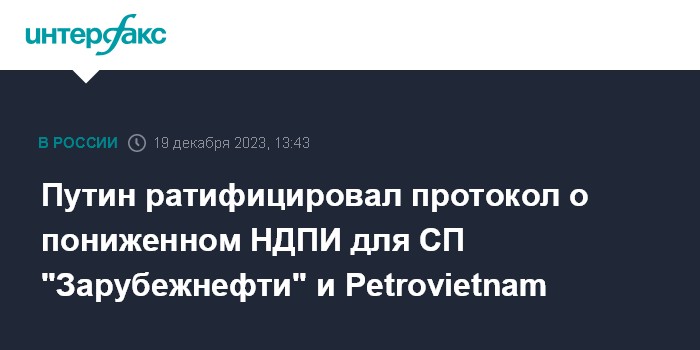 Москва. 19 декабря. INTERFAX.RU - Президент Владимир Путин подписал закон о ратификации протокола к межправсоглашению между Россией и Вьетнамом в нефтегазовой сфере о предоставлении льготной ставки налога на добычу полезных ископаемых для ООО "Совместная компания "Русвьетпетро" (СП "Зарубежнефти" и Petrovietnam).