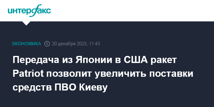 Москва. 20 декабря. INTERFAX.RU - Если Япония изменит правила экспорта вооружений и решит передать США боеприпасы от зенитных ракетных комплексов (ЗРК) Patriot, Вашингтон сможет поставлять Киеву больше средств ПВО, пишет The Washington Post со ссылкой на американские источники.