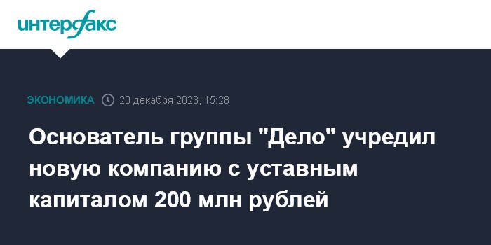 Москва. 20 декабря. INTERFAX.RU - Совладелец группы компаний "Дело" Сергей Шишкарев учредил ООО "Логин Дело" с уставным капиталом 200 млн рублей, свидетельствуют данные ЕГРЮЛ.