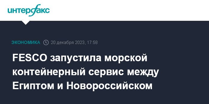 Москва. 20 декабря. INTERFAX.RU - Транспортная группа FESCO (головная компания - ПАО "Дальневосточное морское пароходство", ДВМП) запустила регулярную морскую линию FESCO Egypt Direct Line (FEDL), которая напрямую соединяет Александрию (Египет) с Новороссийском без захода в порты трансшипмента, сообщила компания.