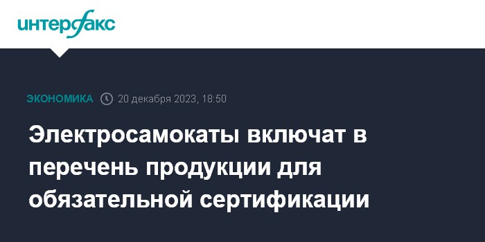 Москва. 20 декабря. INTERFAX.RU - Государственной комиссии по противодействию незаконному обороту промышленной продукции одобрило включение электросамокатов и электродвигателей общего пользования в перечень товаров, подлежащих обязательной сертификации.
