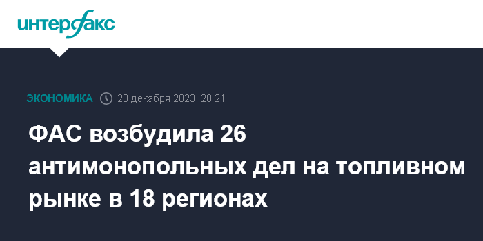 Москва. 20 декабря. INTERFAX.RU - Территориальные органы Федеральной антимонопольной службы (ФАС) возбудили 26 антимонопольных дел в 18 субъектах РФ, сообщила пресс-служба ведомства.
