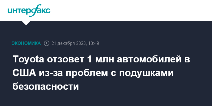 Москва. 21 декабря. INTERFAX.RU - Toyota Motor Corp. сообщила, что отзывает около миллиона автомобилей Toyota и Lexus в США из-за возможных проблем с подушками безопасности.