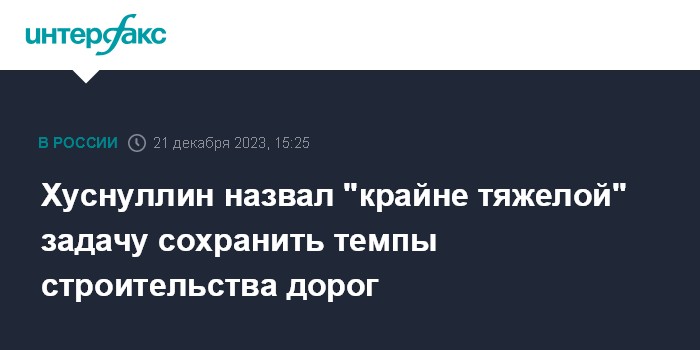 Москва. 21 декабря. INTERFAX.RU - Вице-премьер Марат Хуснуллин назвал "крайне тяжелой" задачу сохранить в 2024 году нынешние темпы дорожного строительства. Об этом он сообщил телеканалу "Россия 24", говоря о планах на будущий год.