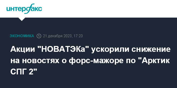 Москва. 21 декабря. INTERFAX.RU - Акции "НОВАТЭКа" к вечеру в четверг ускорили снижение после известий, что компания объявила форс-мажор по проекту "Арктик СПГ 2" из-за американских санкций, о чем сообщило агентство Bloomberg.