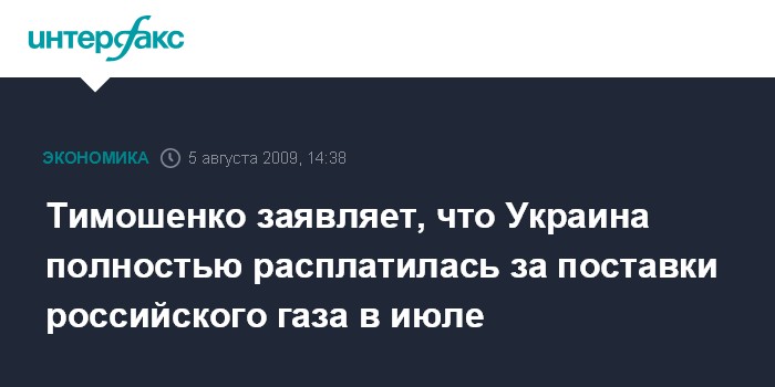 Тимошенко заявляет, что Украина полностью расплатилась за поставки российского газа в июле