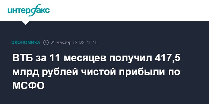 ВТБ за 11 месяцев получил 417,5 млрд рублей чистой прибыли по МСФО
