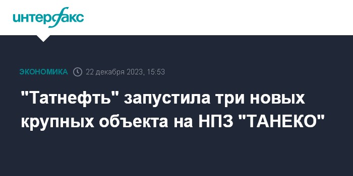 Москва. 22 декабря. INTERFAX.RU - ПАО "Татнефть" в пятницу ввело в эксплуатацию на своем НПЗ "ТАНЕКО" три крупных промышленных объекта, сообщила пресс-служба главы Татарстана Рустама Минниханова, который возглавляет совет директоров НК.