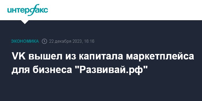 Москва. 22 декабря. INTERFAX.RU - VK вышла из капитала маркетплейса для бизнеса "Развивай.рф", который интернет-компания развивала совместно с Veb Ventures.