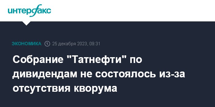 Москва. 25 декабря. INTERFAX.RU - Внеочередное собрание акционеров ПАО "Татнефть", назначенное на 22 декабря, не состоялось из-за отсутствия кворума, сообщает компания.