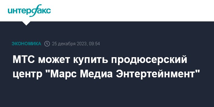 Москва. 25 декабря. INTERFAX.RU - ПАО "МТС" может приобрести продюсерский центр "Марс Медиа Энтертейнмент" (ММЕ), сообщает газета "Коммерсантъ" со ссылкой на источники на медиарынке.