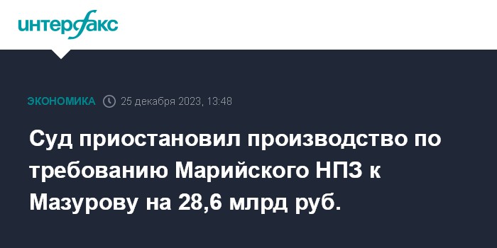 Москва. 25 декабря. INTERFAX.RU - Арбитражный суд Москвы 14 декабря приостановил производство по требованию Марийского НПЗ о включении в реестр кредиторов владельца "Нового потока" Дмитрия Мазурова 28,6 млрд рублей.