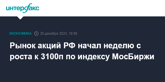 Москва. 25 декабря. INTERFAX.RU - Рынок акций РФ начал неделю с умеренного роста индексов при смешанной динамике blue chips на фоне выходных в Европе и США в связи с празднованием католического Рождества; индекс МосБиржи поднялся к рубежу 3100 пунктов, при этом лидировали на корпоративных новостях бумаги "Яндекса" и "Магнита".