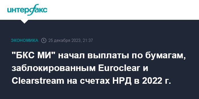 Москва. 25 декабря. INTERFAX.RU - "БКС Мир инвестиций" начал выплаты дивидендов и купонов по части ценных бумаг, которые были заблокированы европейскими центральными депозитариями Euroclear и Clearstream на счетах Национального расчетного депозитария (НРД) в прошлом году, сообщила компания.