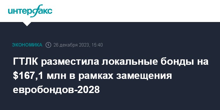 Москва. 26 декабря. INTERFAX.RU - "Государственная транспортная лизинговая компания" (ГТЛК) разместила локальные бонды на $167,1 млн в рамках замещения выпуска еврооблигаций с погашением в 2028 году, сообщила компания на ленте раскрытия информации.