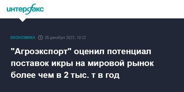 Москва. 26 декабря. INTERFAX.RU - Потенциал экспорта икры рыб из РФ на мировой рынок оценивается в более 2 тыс. тонн в год, сообщает центр "Агроэкспорт" при Минсельхозе.