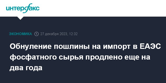 Москва. 27 декабря. INTERFAX.RU - Коллегия Евразийской экономической комиссии продлила действие нулевой ставки ввозной пошлины для отдельных видов фосфатов (код 2510 20 000 0 ТН ВЭД ЕАЭС) на два года - до начала 2026 года.