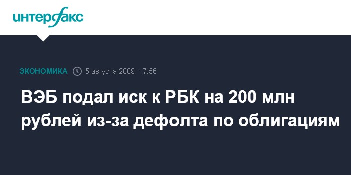 Как пояснили агентству "Интерфакс" в пресс-службе ВЭБа, речь идет о взыскании средств по облигациям РБК (номинальная стоимость и накопленный купонный доход), приобретенным на бирже в начале 2008 года.