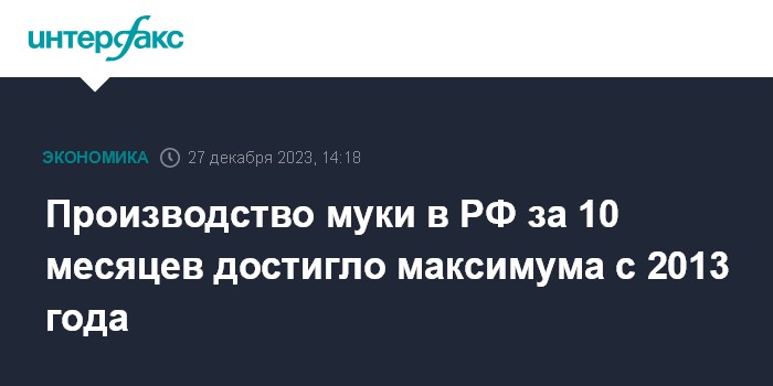 Производство муки в РФ за 10 месяцев достигло максимума с 2013 года