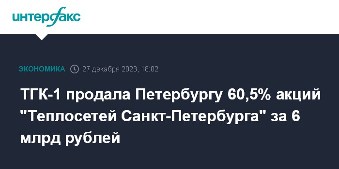 Речь идет о продаже пакета в 23 500 617 000 обыкновенных акций АО "Теплосеть Санкт-Петербурга", сумма сделки - 6 млрд рублей с оплатой равными долями в течение 6 лет. По условиям договора пакет акций перейдет во владение новому собственнику после оплаты первой части платежа не позднее 30 марта 2024 года.
