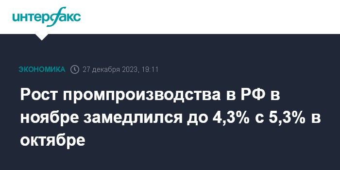 Москва. 27 декабря. INTERFAX.RU - Рост промпроизводства в РФ в ноябре 2023 года замедлился до 4,3% в годовом выражении с 5,3% в октябре после 5,6% в сентябре, 5,4% в августе, 4,9% в июле, 5,8% в июне, 6,7% в мае и 4,9% в апреле, говорится в опубликованном в среду докладе Росстата.