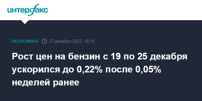 Рост цен на бензин с 19 по 25 декабря ускорился до 0,22% после 0,05% неделей ранее