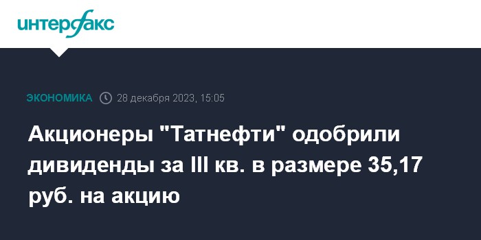 Москва. 28 декабря. INTERFAX.RU - Акционеры "Татнефти" на повторном внеочередном собрании 28 декабря утвердили дивиденды за третий квартал 2023 года в размере 35,17 рубля на акцию (по итогам 9 месяцев - 62,71 руб./акцию, с учетом выплаченных за I полугодие 27,54 руб.), говорится в сообщении компании.