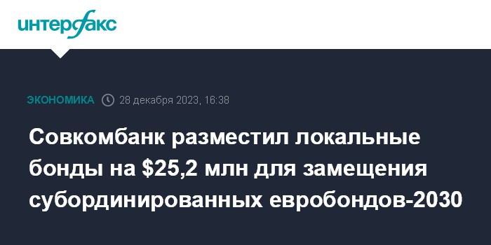 Москва. 28 декабря. INTERFAX.RU - Совкомбанк разместил локальные облигации на $25,2 млн для замещения субординированных евробондов с погашением в 2030 году. Об этом сообщила кредитная организация на ленте раскрытия информации.