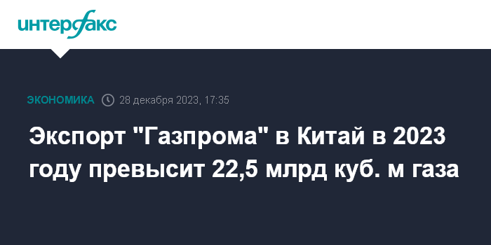 Москва. 28 декабря. INTERFAX.RU - Экспорт российского газа в Китай в 2023 году составит свыше 22,5 млрд куб. м газа, заявил председатель правления "Газпрома" Алексей Миллер на предновогоднем итоговом селекторе в компании.