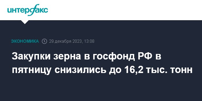 Закупки зерна в госфонд РФ в пятницу снизились до 16,2 тыс. тонн