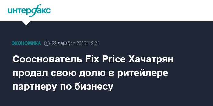 Москва. 29 декабря. INTERFAX.RU - Сооснователь Fix Price Артем Хачатрян вышел из капитала ритейлера, продав 35,2% акций, сообщила компания.